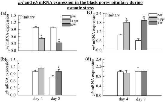 Since black porgy, A. schlegelii, is an euryhaline teleost that migrates from near-shore shallow areas to coastal waters near land or in estuaries during its larval to the juvenile stage [49], osmoregulation is an important way for it to maintain a stable internal environment. The purpose of this study was to investigate the changes in gh/prl hormone gene expression in the pituitary gland, as well as their ghr/prlr/gr (isoform-1) receptors in the gill, kidney, and intestine, as well as serum osmolality and chloride concentrations when the black porgy were transferred from SW to 4 ppt and FW and vice versa at different salinity levels.