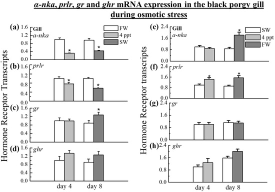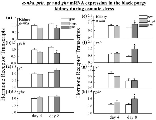 During the transfer from FW to SW, the α-nka (0.81-fold in SW, p < 0.05) and prlr (0.62-fold in SW, p < 0.05) transcripts were significantly decreased in the kidney on day 8 (Figure 5a,b). On the other hand, the α-nka (1.3-fold in FW, p < 0.05), prlr (2.2-fold in FW, p < 0.05), and ghr (1.66-fold in FW, p < 0.05) transcripts were elevated during the transfer of fish from SW to FW on day 8 (Figure 5e,f,h). When the black porgy were transferred from FW to 4 ppt and SW, the gr and ghr mRNA showed no significant difference in the kidney (Figure 5c,d), and during the transfer from SW to 4 ppt and FW, fish did not show a significant difference in gr mRNA levels in the kidney on day 4 and day 8 (Figure 5g).