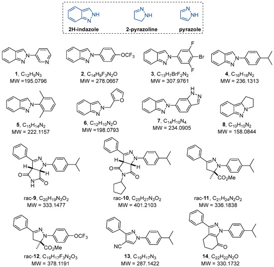 Consequently, in addition to the well-known pyrazoles, both indazole and pyrazoline chemotypes represented interesting and privileged chemical scaffolds endowed with biological activity, including antibacterial properties [21,22]. Due to these considerations, we selected a small library of fourteen synthetic entities including indazoles, pyrazoles and pyrazolines (Figure 1) for a detailed antimicrobial evaluation. Amongst these, eight compounds were 2H-indazoles, including a fused tricyclic system (compound 8), a tetrahydroindazole (compound 14), and an unusual bis-indazole (compound 7). The remaining structures were pyrazoline derivatives: 11 and 12 are 4,5-dihydro-1H-pyrazoles, whereas 9 and 10 possess a pyrazoline ring decorated with a ring-fused imide moiety.