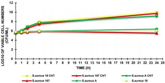 Killing curve assays for compound 9 were performed on the three isolates of S. aureus (two of which were MRSA) selected for the study, as previously reported [49,50].