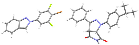 Amongst the eight 2H-indazoles tested in this study, three compounds (2, 3 and 5) displayed weak to modest activity against different Gram-positive clinical isolates. Compounds 2 and 3 showed MIC values of around 128 μg/mL, specifically on strains of the E. faecalis species, while compound 5 displayed a wider spectrum of action, showing MIC values ranging from 64 to 128 μg/mL on both staphylococcal species evaluated in this study, i.e., S. epidermidis and S. aureus, including MDR strains. On the contrary, the other 2H-indazoles were found to be inactive. It was found that the substitution on the N-aryl ring is tolerated in the ortho, meta, and para positions. As the trihalogenated compound 3 is a crystalline material, X-ray diffraction [47] was used to confirm its structure, which indicates coplanarity of the ring systems (Figure 3), which is also anticipated for compound 2. On the other hand, compound 5 is expected to display the twisting of the ring systems due to the sterically demanding 2,6-dimethylbenzene system. The weak activity of these three species may point towards a lack of crucial binding groups including H-bond donors; however, due to the small size of these molecules, further structural editing will allow for second-generation compounds that may possess improved antimicrobial activities.
