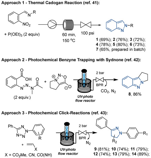 As summarised in Scheme 1, flow protocols reported previously by our group were exploited to generate the heterocyclic entities studied in this work. These included a high-temperature approach for accessing 2H-indazoles via a continuous Cadogan reaction [41] (compounds 1–7). The tricyclic indazole scaffold 8 was accessed by a scalable photochemical flow route exploiting the in-situ formation of benzyne and its trapping with a proline derived sydnone [42]. Lastly, an interesting photochemical cycloaddition-based route converts aryl tetrazoles via nitrile imine dipoles into pyrazolines [43] (compounds 9–12). The latter approach also allowed for the accessing of pyrazoles 13 and 14 that resulted from subsequent aerobic oxidation of the selected pyrazolines. All of these flow approaches have in common that the desired heterocyclic targets can be accessed in good to excellent yields in a highly reproducible manner.