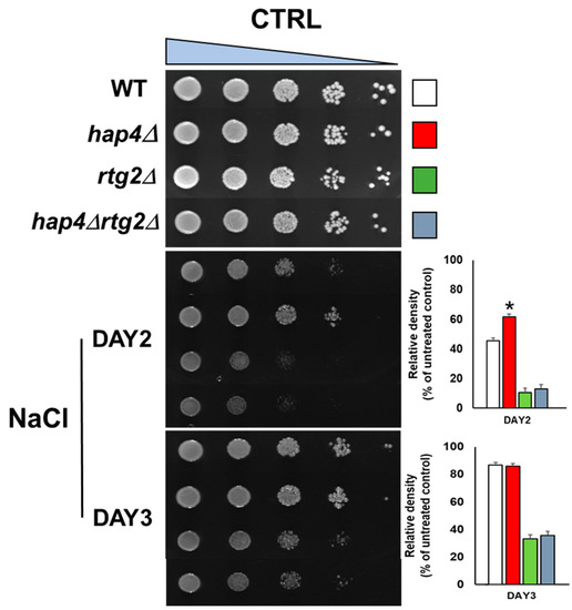 Sensitivity of wild type and mutant cells to sodium chloride. Wild type (WT) and mutant cells, lacking HAP4 (hap4∆), RTG2 (rtg2∆), or HAP4 and RTG2 (hap4∆ rtg2∆), were grown overnight in YPD medium and diluted to 1 OD600, and ten-fold serial dilutions were spotted on YPD plates without (CTRL) or with 0.8 M sodium chloride (NaCl). Growth was scored after 2–3 days. Growth on plates was quantified by using a quantitative imaging-based protocol described in Petropavlovskiy et al. [22]. Data were analyzed using unpaired Student’s t-test: * p < 0.01 was considered significant when comparing wild type versus hap4∆ cells at day 2 from three independent experiments.