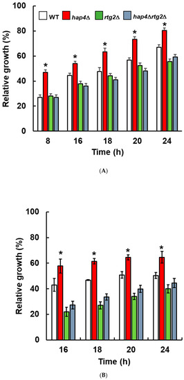 Relative growth of wild type and mutant cells in the presence of NaCl. (A) Wild type (WT) and indicated mutant cells (hap4∆, rtg2∆, hap4∆rtg2∆) grown overnight in YPD were diluted to 0.01 OD600 in fresh liquid YPD with or without 0.8 M sodium chloride (NaCl), and optical density was measured at 600 nm (OD600) over time with a high-precision TECAN microplate reader. (B) Wild type (WT) and indicated mutant cells (hap4∆, rtg2∆, hap4∆rtg2∆) grown overnight in YPD were diluted to 0.1 OD600 in fresh liquid YPD batch cultures with or without NaCl 0.8 M and optical density (OD600) was measured at the indicated times. In both (A,B), relative growth was calculated as the percentage of the OD600 of stressed/control cells. Unpaired Student’s t-test: a statistically significantly difference with * p < 0.01 when comparing wild type versus hap4∆ cells from three independent experiments.