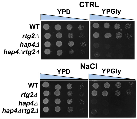 It is well-established that mitochondria are important determinants of efficient stress adaptation. To gain insight into the role of mitochondrial function in cellular osmostress response, wild type (WT) and mutant yeast cells lacking HAP4 (hap4Δ), RTG2 (rtg2Δ), and both genes (hap4Δrtg2Δ) were analyzed by spotting assay for cell growth with glucose as the sole carbon source in the presence and in the absence of NaCl as stressor. It has been previously demonstrated that the concentration of 0.8 M NaCl is associated with an intermediate salt stress phenotype [13]; thus, we chose this concentration for all the experiments.