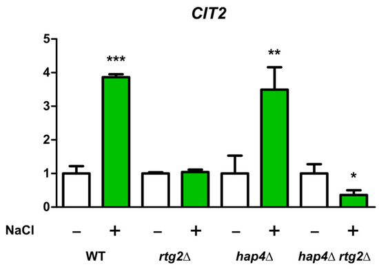 We have previously shown that RTG pathway is activated by NaCl [13]; thus, to gain more insight into the molecular mechanisms supporting the growth advantage of hap4Δ upon salt stress, the expression of CIT2 was analyzed in all cell types with or without stress (Figure 4). About a four-fold CIT2 increase was observed in the absence of HAP4 upon stress. This upregulation was comparable to WT cells and, as expected, absent in RTG2-lacking mutants. CIT2 expression was further downregulated in hap4Δrtg2Δ cells.