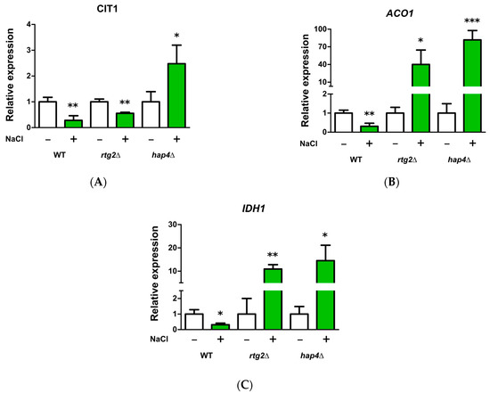 It has been previously reported that mitochondrial TCA cycle enzymes increased upon osmoshock and that the RTG pathway controls the expression of selected TCA cycle genes in cells with compromised respiratory function [8,14]. Thus, to gain insight into the mechanisms of faster osmoadaptation, the expression of these genes (CIT1, ACO1, and IDH1) was analyzed after 5 h in WT and in mutant cells lacking HAP4 or RTG2 in the absence or presence of stress (Figure 5). It is noteworthy that CIT1 expression was significantly upregulated by NaCl in hap4Δ cells and was conversely downregulated in WT and rtg2Δ in the same conditions (Figure 5A). The expression of ACO1 and IDH1 reached very high levels in hap4Δ cells treated with NaCl compared with relative controls and WT cells, in which a downregulation due to the stress was observed in both genes. (Figure 5B,C). In cells lacking RTG2, the expression of these two genes was increased in the presence of NaCl, although to a lesser extent than that observed in hap4Δ (Figure 5B,C).