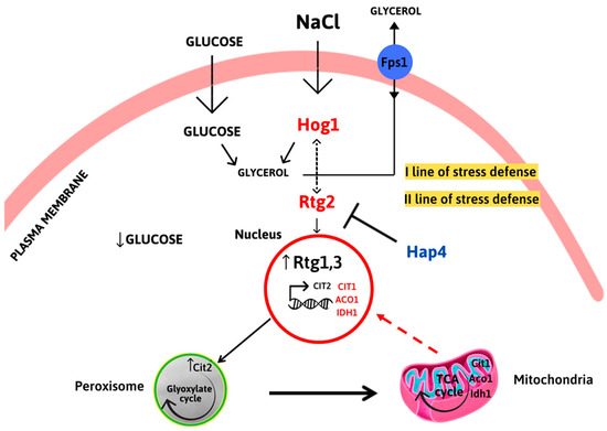 Hog1, the main regulator of osmostress, induces a rapid and transient cytoplasmic response that acts on glycerol accumulation and transport through the aquaglyceroporin Fps1p. RTG signaling is activated in the second line of stress defense, as determined by CIT2 upregulation, to sustain peroxisome–mitochondria cross-talk and mitochondrial metabolic function. HAP4 might act directly or indirectly as a negative regulator of RTG-dependent expression of TCA cycle genes CIT1, ACO1, and IDH1.