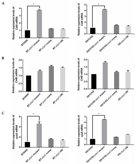Various cell-wall-degrading enzymes and genes contribute to C. michiganensis infection of tomato. In the current experiment, three genes were examined for further investigation: xylanases encoded by xysA and xysB and pectate lyase encoded by pelA, which are putatively involved in canker production and tissue maceration. The relative expression levels of these three genes showed the same tendency, with the transcription levels all higher in the △pbpC mutants than in the wild-type strains and other transformants for both strains, BT0505 and GS12102. The relative expression of xysA and xysB exhibited statistically significant 6–8- and 5–6-fold increases (Figure 1C,D), respectively. A 3–4-fold increase in the expression level of pelA was also induced (Figure 1E).