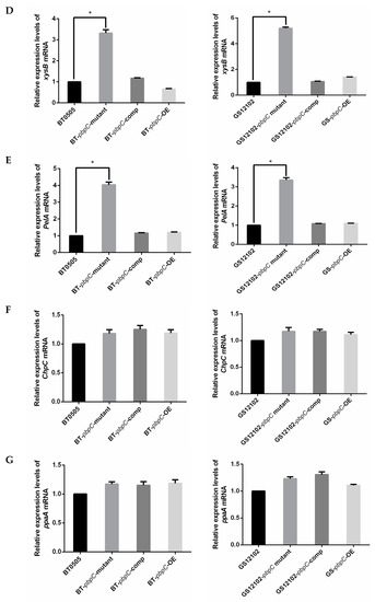 Relative expression levels of (A) CelA, (B) CelB, (C) xysA, (D) xysB, (E) pelA (F) ChpC, and (G) ppaA determined by quantitative reverse-transcription polymerase chain reaction (qRT-PCR) for BT0505 and GS12102, the △pbpC mutants, pbpC-comp, and pbpC-OE strains compared with their wild-type strains. Relative gene expressions were normalized by gyrB, gapA, and bipA, which we employed as housekeeping references. Results are presented as means of three independent experiments with standard deviation (n = 3). Asterisks (*) indicate significant differences (p < 0.05).