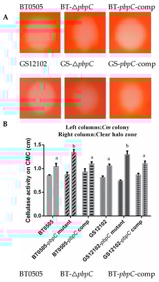 Bacterial cell-wall-degrading enzymes such as cellulase, amylase, xylanase, and polygalacturonase may be pivotal virulence factors that cause wilting in tomatoes by degrading plant cell wall components [42]. In this study, the secretion of endocellulase activity was qualitatively assessed through plate assays using Congo red staining. Hydrolysis halos surrounding the bacterial colonies were observed in visualization, indicating a notable enhancement in exoenzyme activities. Compared with the wild-type and complementation strain, the △pbpC mutant had stronger cellulase activities through incubation with the substrate carboxymethylcellulose (CMC). The ratio of the diameter between bacterial colonies and the clear halo zone was significantly different (p < 0.05) in cellulose hydrolyzation, with clear halo zone values of 1.04 ± 0.08 and 1.07 ± 0.03 cm in the wild-type BT0505 and GS12102 strains, respectively; 1.34 ± 0.07 and 1.31 ± 0.07 cm in the △pbpC mutants derived from BT0505 and GS12102, respectively; and 1.10 ± 0.05 and 1.11 ± 0.06 cm in the pbpC-comp strains, respectively (Figure 2A). The amylase activity of △pbpC mutants was extremely activated, which was reflected by the hydrolytic halo zone. It was observed from the violet background staining, which showed diameters of 1.75 ± 0.04 and 1.93 ± 0.05 cm in wild-type BT0505 and GS12102 strains, respectively; 3.02 ± 0.08 and 3.27 ± 0.03 cm in the △pbpC mutants, respectively; and 1.77 ± 0.05 and 1.74 ± 0.08 cm in the pbpC-comp strains, respectively (Figure 2B). Consequently, the secretion of exoenzymes was largely enhanced by a lack of pbpC in both strains BT0505 and GS12102 of C. michiganensis, which could be a factor modulating bacterial pathogenicity.