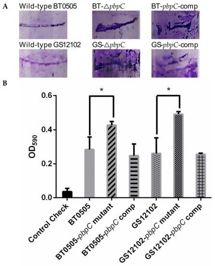 The results of the biofilm assays indicated that all the C. michiganensis strains had taken the shape of clear biofilm fringes on the wall surfaces of the polystyrene tubes. However, the mutants that lacked pbpC exhibited stronger biofilm formation than the wild-type strains and their derivatives (Figure 3A). Quantification assays were performed by staining with crystal violet and washing with ethanol, then the optical density of the solution was measured at 590 nm (OD590). The results exhibited that the pbpC deletion mutants formed significantly (p < 0.05) more biofilm than the wild-type and pbpC-comp strains, both in BT0505 and GS12102 (Figure 3B). This finding revealed that pbpC has effects on biofilm formation in C. michiganensis.