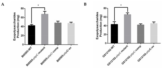The EPS from liquid-shaking cultures produced by different C. michiganensis strains were extracted and isolated successfully. Bacterial cells were removed by centrifugation after ethanol precipitation overnight at 4 °C. The EPS production without proteins was obtained and weighed after lyophilization. The quantitative results demonstrated that the mass of EPS isolated from △pbpC mutants was significantly higher than those of wild-type, pbpC-comp, and pbpC-OE strains (Figure 4). The EPS produced by the △pbpC mutants was 2 g/L of bacterial cells (1010 CFU/mL).