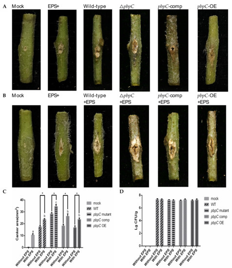 The tomato stem cracking symptoms and canker area affected by EPS were assessed at 14 dpi. The lesions caused by the GS12102-△pbpC mutants were much larger than those caused by the wild-type, pbpC-comp, and pbpC-OE GS12102 strains; the canker areas were 28.46 ± 1.01, 17.47 ± 1.25, 18.24 ± 1.55, and 16.75 ± 1.50 mm2, respectively (Figure 7A,C). It was found that the enhancement in pathogenicity induced by △pbpC in C. michiganensis was a consistent result, as we also observed in our previous study on strain BT0505 [17]. Furthermore, bacterial EPS was also supported as an influencing factor for pathogenicity by the assay of injecting EPS into wounds after puncturing, which led to lesions of 10.53~±~1.53 mm2 on tomato stems (Figure 7B,C). Moreover, with the injection of EPS after C. michiganensis inoculation, the canker lesion sizes were significantly (p < 0.05) larger than those of the inoculated plants without EPS injections. The canker areas caused by the pbpC mutants, wild-type, pbpC-comp, and pbpC-OE strains were 34.62 ± 1.63, 23.60 ± 0.80, 26.31 ± 1.95, and 23.62 ± 1.29 mm2, respectively (Figure 7B,C). However, the number of bacterial cells reisolated from the lesions did not significantly differ among treatments (Figure 7D). The results revealed that EPS is a critical factor for increasing pathogenicity in C. michiganensis.
