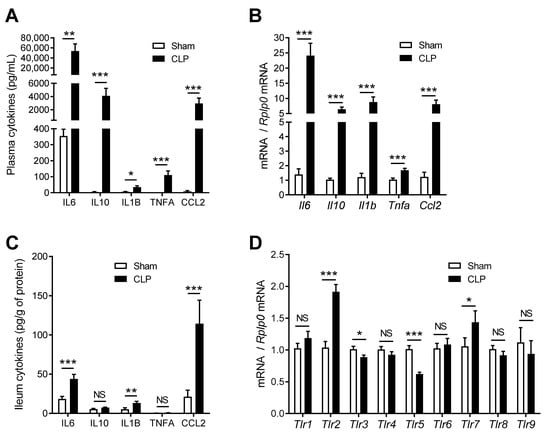 2.1. CLP Induces Systemic Inflammation and Modulates Inflammatory Gene Expression in the Gut