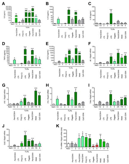 2.2. TLR Agonists Increase Cytokines and Expression of TLRs
