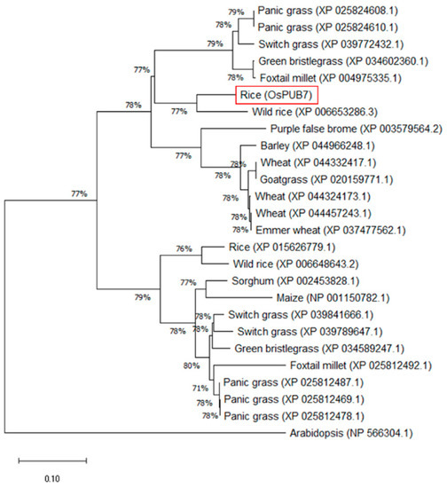 Phylogenetic analysis of OsPUB7 in various plant species. The phylogenetic tree was constructed using the neighbor-joining method of MEGAX. The numbers represent bootstrap values from 1000 replicates.