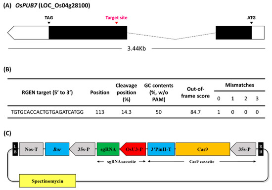 Designing of sgRNA based on CRISPR RGEN Tool (http://www.rgenome.net/ accessed on 2 September 2020). (A) Selection of the target region of OsPUB7 using the CRISPR RGEN tool. (B) The position of the sgRNA target sites in the OsPUB7 sequence. (C) Construction of the Ti-plasmid vector of the sgRNA region for CRISPR/Cas9-mediated mutagenesis of OsPUB7 in rice. LB, left border; RB, right border; Nos, nopaline synthase terminator; Bar, basta resistance gene; sgRNA, single guide RNA; OsU3-P, Oryza sativa U3 promoter driven sgRNA cassette; Cas9, human codon-optimized Cas9 expressing cassette.