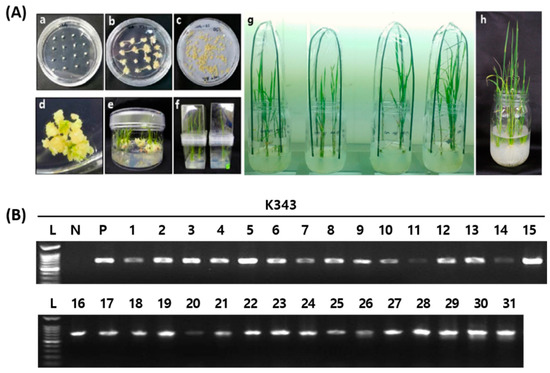 Development of transgenic rice plants with CRISPR/Cas9-OsPUB7 vector using Agrobacterium-mediated transformation. (A) Dongjin (WT) transformed with pPZP-3′PinII-Bar vector containing the CRISPR/Cas9:sgRNA gene: (a) seeds plated on 2N6 media; (b) callus formation; (c) Agrobacterium co-culture in 2N6 AS media; (d,e) multi-shoot differentiation; (f) regenerated plants in rooting medium; (g,h) acclimation in tissue culture room and planted in soil. (B) Detection of sgRNA/Cas9-mediated DNA modifications using PCR analysis of bar and nos terminator regions. L, DNA ladder; N, negative control (sterile water); P, positive control (plasmid vector).