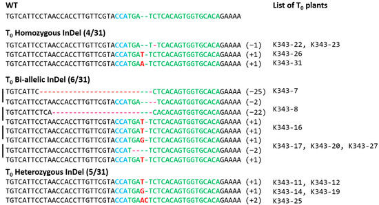 Identification of mutation genotypes in OsPUB7 generated using CRISPR/Cas9 technology using NGS analysis in Dongjin (WT) and T0 plants. Green indicates the target sequence, and blue indicates the PAM region. The InDel sequence of the target locus is shown in red. Deletion in the analysis region is indicated by “-”, and insertion is indicated by an insertion of nucleotide such as “T” or “G”. The minus (−) and plus (+) signs indicate the number of nucleotides deleted and inserted at the target sites, respectively. WT, wild type sequence with no mutations.