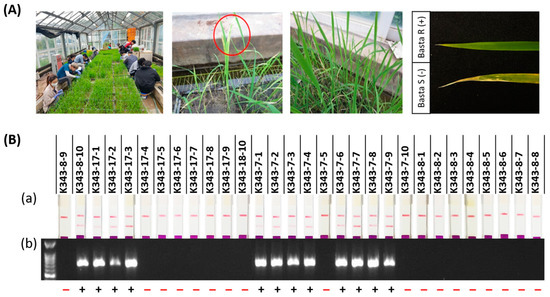 Agrobacterium-mediated transformation of embryogenic callus was performed by Lee et al. [52]. After 4 weeks of rooting, the regenerated rice plants were transferred to pots in a greenhouse maintained at 30 °C during the day and at 23 °C at night. Genomic DNA was extracted from the leaves of T0 individuals confirmed to harbor the T-DNA for gene mutation type analysis and mutant selection. Deep-sequencing was performed to amplify the genomic region containing the CRISPR/Cas9 target sites using specific primers adjacent to the designed target site [53]. PCR amplicons were sequenced by forming paired-end reads using MiniSeq (Illumina, San Diego, CA, USA). The NGS data obtained were analyzed using Cas-Analyzer (https://www.rgenome.net/cas-analyzer accessed on 5 April 2021) [54]. Reads that occurred only once were excluded to remove errors associated with amplification and sequencing. Insertion and deletion mutations were considered as mutations induced by Cas9. To select null lines without T-DNA, 40 ppm of basta solution was used to treat individuals that generated more than six leaves after the T1 generation. The basta solution was embedded in a gauze and placed on a part of the seedling leaves grown to the six-leaf stage, which were observed after 7 days to distinguish between resistance and sensitivity. These plants were also used to reconfirm whether they were resistant or sensitive using the bar strip test. T-DNA-free plants were selected on the basis of the death of the leaves after basta treatment and the absence of bands in the bar strip experiments. Finally, PCR analysis was performed on null lines clearly lacking the T-DNA using a bar primer, and individuals with no band in 1% agarose gel electrophoresis were selected as the final null T1 lines.