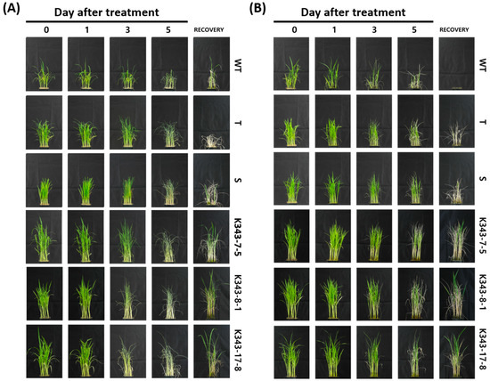 The T2 OsPUB7 gene-edited null lines (PUB7-GE), K343-8-1 and K343-17-8, along with control varieties Dongjin (WT), Sangnambat (T), and Gaya (S), were subjected to drought stress treatment (Figure 6A). As a result of drought stress treatment, all Dongjin, Sangnambat, and Gaya plants stopped growing completely and dried with a damage level of 4 on the 5th day after the treatment. Most plants were permanently dried and did not recover, even after watering. K343-7-5 plants had a similar phenotype to that before stress treatment until the 3rd day of drought stress treatment, and the damage level was 3 to 4 on the 5th day after drought stress treatment. The K343-8-1 and K343-17-8 plants stopped growing and dried; almost all plants showed a damage level of 4 on the 5th day after the drought treatment. However, most of them showed normal growth in the recovery stage and recovered to damage level 2.