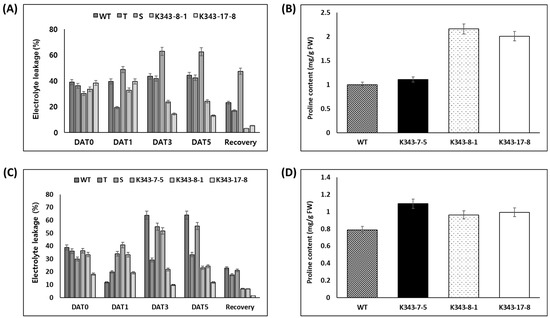 To confirm the degree of tolerance to stress treatment in terms of physiological traits, T2 PUB7-GE were subjected to ion leakage and proline content analyses. The degree of ion leakage before and after drought stress treatment was analyzed in three replicates using 100 mg leaves. Results showed that ion leakage with cell damage had the following order: Gaya (S, 62.37%), Dongjin (WT, 44.19%), Sangnambat (T, 42.19%), K343-8-1 (24.03%), and K343-17-8 (12.86%) on the 5th day after drought stress treatment. In addition, T2 PUB7-GE maintained a low level of ion leakage during recovery, with a tendency similar to that observed before recovery (Figure 7A). To confirm the degree of tolerance to drought stress treatment, proline content analysis was performed on the 3rd day, when the phenotype started to appear (Figure 7B). The results showed that the proline content of WT was 1.001 mg/g, whereas that of K343-7-5 was 1.108 mg/g, that of K343-8-1 was 2.160 mg/g, and that of K343-17-8 was 2.011 mg/g, which were approximately 10–110% more than that of the WT.