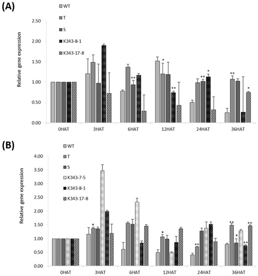 To survey the expression level of OsPUB7 during abiotic stress treatment, qRT-PCR analysis was performed using the leaves 0, 3, 6, 12, 24, and 36 h after drought and salinity stress treatment (Figure 8A). At 3 h after drought stress treatment, T2 PUB7-GE appeared to show the highest gene expression, although finally, the expression did not differ significantly between WT and PUB7-GE or between individuals. This suggested that although OsPUB7 harbored a mutation introduced using the CRISPR/Cas9 technology, the transcriptional regulatory region of the gene functioned normally. Transcription of OsPUB7 occurs normally, although translation is believed to be restricted due to the creation of an early stop codon (due to a codon frame shift caused by an InDel). Similar to that observed for drought stress treatment, RNA expression did not differ significantly between WT and PUB7-GE, nor was any specific trend in expression change observed after salinity stress treatment (Figure 8B).