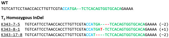 Before confirming the codon frame shift in T2 PUB7-GE, the genotypes of the lines showing tolerance to abiotic stress were analyzed. Results confirmed that all bi-allelic genotypes in the T0 generation were fixed as homozygous genotypes in the T2 generation, and the mutation types were identified as 2-bp deletion and 1-bp insertion, respectively (Figure 9).