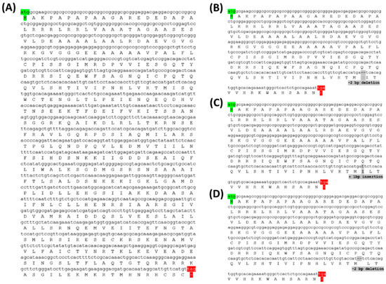 Amino acid sequence based on nucleotide sequence of PUB7-GE. Green indicates the start codon, red indicates the stop codon, and gray indicates the InDel mutation type. (A) OsPUB7 wild type. (B) PUB7-GE K343-7-5. (C) PUB7-GE K343-8-1. (D) PUB7-GE K343-17-8.