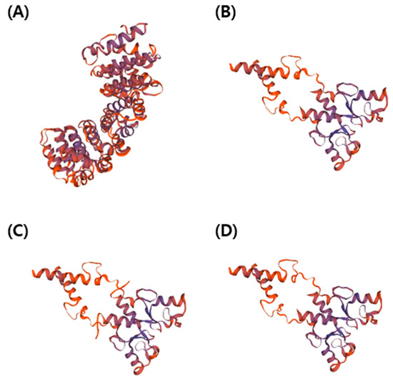3D protein structure based on amino acid sequences of the gene-edited PUB7-GE. (A) OsPUB7 wild type. (B) PUB7-GE K343-7-5. (C) PUB7-GE K343-8-1. (D) PUB7-GE K343-17-8.