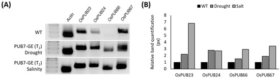Expression analysis of OsPUB23, OsPUB24, OsPUB66, and OsPUB67 after drought and salinity stress treatment in T2 PUB7-GE. (A) Confirmation of the mRNA expression of stress-related genes in PUB7-GE 12 h after stress treatment using agarose gel electrophoresis. (B) Band intensity was quantified using ImageJ.