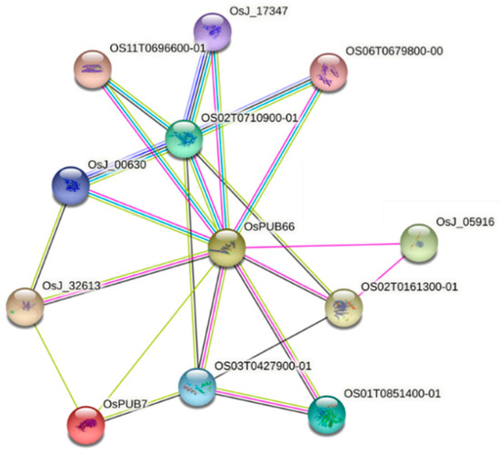 We aimed to identify the interaction between genes related to abiotic stress tolerance [35] and OsPUB7. Comparison of gene expression levels using T2 PUB7-GE mRNA derived after stress treatment revealed that the mRNA levels of the four genes, OsPUB23, OsPUB24, OsPUB66, and OsPUB67, increased (Figure 12). String DB-based protein interaction analysis between OsPUB7 and OsPUB families revealed that a 1-node network was formed with OsPUB66 (Figure 13). This indicated the functional association between OsPUB genes; it can be inferred that OsPUB7 acts as a negative regulator in WT and that OsPUB23, OsPUB24, OsPUB66, and OsPUB67 act to show tolerance to drought and salinity stress after knocking out OsPUB7.