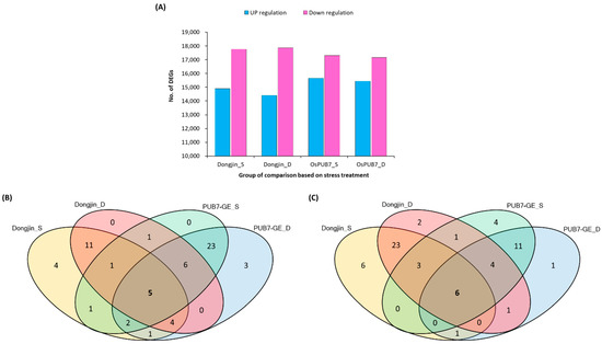 Comparative analysis of differentially expressed genes (DEGs) after drought and salinity stress treatment. (A) Number of down-regulated and up-regulated DEGs in samples in response to stress treatment. (B) Venn diagram of down-regulated genes in PUB7-GE (K343-8-1) vs. WT (Dongjin). (C) Venn diagram of up-regulated genes in PUB7-GE (K343-8-1) vs. WT (Dongjin).