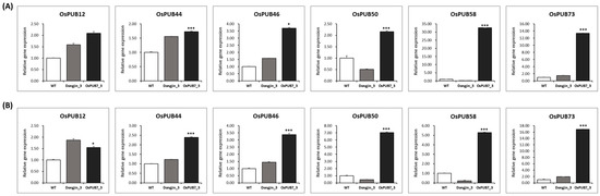 To validate the results of sequencing analysis, qRT-PCR was performed using six OsPUB genes, which are abiotic stress-responsive genes selected from the in silico analysis of DEGs (Figure 15). Interestingly, RNA-sequencing analysis confirmed that, with the exception of OsPUB12, the remaining five genes showed significantly higher expression levels. The results of qRT-PCR of all six genes showed an up-regulated expression pattern in the OsPUB7-edited line.