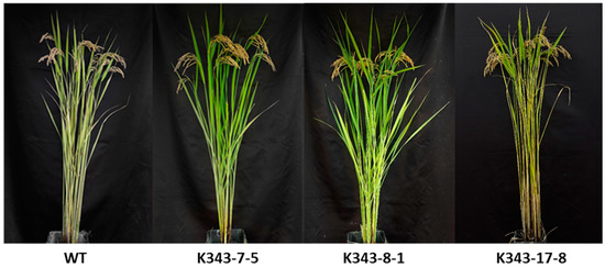 To observe the growth of T3 PUB7-GE in a rice field, major agricultural traits such as plant height, culm length, panicle length, and number of tillers were investigated (Table 3, Figure 16). The plant height and number of tillers of K343-7-5 did not differ to those of WT, although culm length was approximately 4.8 cm shorter and panicle length was approximately 5 cm longer. K343-8-1 did not differ from the WT in terms of the four agricultural traits. The culm length, panicle length, and number of tillers of K343-17-8 did not differ from those of the WT, although plant height was approximately 4.8 cm longer than the WT. Despite some differences between OsPUB7-edited lines, overall, the agricultural traits were similar to those of WT, suggesting that gene editing using the CRISPR/Cas9 technology did not significantly affect genes other than OsPUB7.