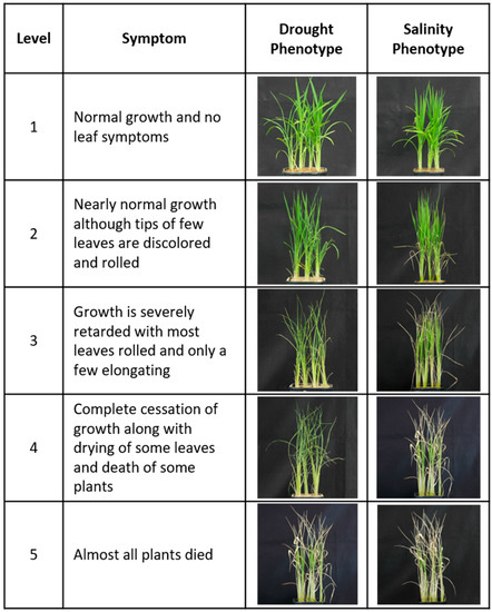 For the screening of salinity stress tolerance of the GE null lines, 4-week-old plants of salt-tolerant Cheongho and susceptible Nampyeong were treated with 250 mM sodium chloride (NaCl). NaCl solution was replaced once every two days to prevent the reduction of salt concentration due to absorption and evaporation during treatment. The screening was stopped when the susceptible Nampyeong showed clear signs of damage. The plant was then irrigated with clean water and allowed to recover for 2 weeks. Leaf rolling and leaf drying were evaluated [55] when the susceptible variety showed symptoms under stress. The seedlings were evaluated using the scales described in IRRI [56]: 1 = normal growth and no leaf symptoms, 2 = nearly normal growth although tips of few leaves are discolored and rolled, 3 = growth is severely retarded with most leaves rolled and only a few elongating, 4 = complete cessation of growth along with drying of some leaves and death of some plants, and 5 = almost all plants died (Figure 17).