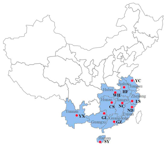 The lab-raised susceptible S. litura strain Lab-S was reared as previously described [33] with no pesticide exposure for over five years. Eleven field populations of S. litura were collected from southern China (Figure 1) and named Yunnan (Yuxi, YX), Anhui (Hefei, HF), Hubei (Wuhan, WH), Jiangsu (Yancheng, YC), Jiangxi (Nanchang, NC), Zhejiang (Lishui, LS), Fujian (Ningde, ND), Hunan (Changsha, CS), Guangdong (Guangzhou, GZ), Guangxi (Guilin, GL), and Hainan (Sanya, SY). Among the above field-collected populations of S. litura, the GZ, YX, and ND populations displayed middle to high levels of resistance to the three insecticides metaflumizone, chlorantraniliprole, and pyridalyl, respectively, according to our previous work [33]. The GZ, YX, and ND populations and the Lab-S strain were used to establish the cross-resistance patterns. All populations were maintained in a well-controlled growth chamber at 26 ± 2 °C with 65 ± 5% relative humidity and a 16/8 h light/dark photoperiod. All larval populations were fed an artificial diet, and adults were reared on a 10% sugar solution.