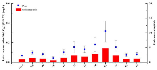 The LC50 values were calculated for broflanilide and 10 other popular insecticides using S. litura larvae (Table 1). Broflanilide showed the highest toxicity against S. litura (LC50 = 0.08 mg/L), followed by abamectin (0.10 mg/L), tetraniliprole (0.19 mg/L), spinetoram (0.46 mg/L), chlorfenapyr (0.88 mg/L), chromafenozide (0.91 mg/L), pyridalyl (1.22 mg/L), cyantraniliprole (1.32 mg/L), chlorantraniliprole (2.21 mg/L), metaflumizone (3.61 mg/L), and flubendiamide (9.95 mg/L); these compounds were 1.3, 2.4, 5.8, 11.0, 11.4, 15.3, 16.5, 27.6, 45.1, and 124.4 times less toxic than broflanilide, respectively. The baseline broflanilide susceptibility was then determined in S. litura populations collected from 11 Chinese provinces (Figure 1) and compared to that of the susceptible Lab-S strain. Little broflanilide resistance was observed in any of the field populations (Figure 2).
