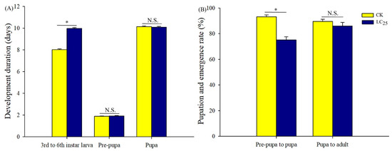 Development duration (A) and pupation and emergence rates (B) of Spodoptera litura. Yellow, control (CK) individuals. Dark blue, individuals treated with the 25% lethal concentration (LC25) of broflanilide. Values are presented as the mean ± standard error. * p < 0.05 (Student’s t-test) and N.S. indicates not significant.