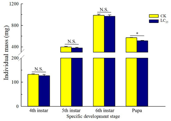 Spodoptera litura larval weight at selected developmental stages. Yellow, control (CK) individuals. Dark blue, individuals treated with the 25% lethal concentration (LC25) of broflanilide. Values are presented as the mean ± standard error. * p < 0.05 (Student’s t-test) and N.S. indicates not significant.