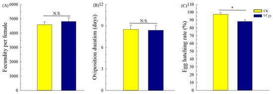 Fecundity (A), oviposition duration (B), and egg hatching rate (C) of Spodoptera litura. Yellow, control (CK) individuals. Dark blue, individuals treated with the 25% lethal concentration (LC25) of broflanilide. Values are presented as the mean ± standard error. * p < 0.05 (Student’s t-test) N.S. indicates not significant.