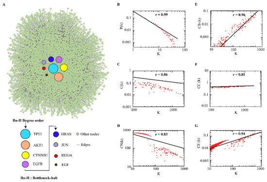 We extracted 86 colorectal cancer-related proteins from the KEGG database which to further fetch the interacting partners in the STRING database. The constructed CRC–PPIN consists of 6556 nodes and 32,048 edges (Figure 1A). The statistical analysis of the topological parameters’ degree and BC of all 6556 nodes is given in (Supplementary Table S1). The statistical parameters of the CRC–PPIN followed power-scaling behavior against k. In overall analysis, (P(k)) obeys power law distribution with a value of exponent (Figure 1B), where the regression line fitted with the curve to the data point with with correlation coefficient (r) 0.92 fitted with the data. The value provides hierarchical scale-free behavior to the network. The clustering coefficient C(k) also followed the power law scale as a function of degree with a negative exponent value of , which showed that the CRC–PPIN follows a hierarchical nature. The straight line fitted curve with results from a coefficient value correlated to the data set (Figure 1C). The neighbourhood connectivity showed a negative exponent value (β ) given using the power-law fitting model . The fitted curve line with gives the correlation coefficient (Figure 1D). The network showed a disassortative nature due to the calculated negative value of , the exponent of connectivity parameter, and reflects that the Bn-Hs are still a significant part of regulating the stability of the network. To recognize the importance of the Bn-H nodes’ strength in signal processing in a network, we used three topological centrality parameters, such as closeness centrality , betweenness centrality and eigenvector . In the CRC–PPIN, these parameters followed power law against degree (K) and showed positive exponents values, indicating the strong regulating behavior of the leading Bn-H. The calculated values of exponents and correlation coefficients (r) are , (Figure 1E–G). The graph of betweenness against degree showed that high-connecting nodes have more controlling strength to outspread signals throughout the network. Our network followed a hierarchical scale-free nature and means that the network has a modular structure and system level of organization.