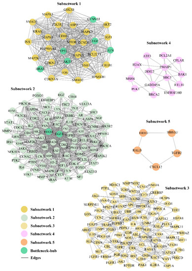 In the CRC–PPIN, we identified the five SNs that are highly interconnected clusters of nodes representing corresponding stable units that function as a single entity in the network (Figure 2). The SN-1 had 31 nodes and 422 edges with the highest M-scoring value (28.13). The second, third, fourth, and fifth SNs consisted of 86, 95, 14, and 5 nodes, respectively, with the corresponding edges of 681, 284, 28, and 5 (Figure 3). These SNs have a system-level organization that was maintained by connecting with other nodes and provided overall functionality to the network [43]. We found six (TP53, AKT1, CTNBB1, HRAS, JUN, and EGF) and two Bn-Hs (EGFR and RHOA) present in SN-1 and 2, respectively, which not only controls the internal regulation of their SN but also influences other subnetworks by interacting with different nodes. SNs 3, 4, and 5 showed the absence of Bn-Hs, suggesting that Bn-Hs are indirectly connected with the modular function of these three SNs (Figure 2). Crosstalk between the SNs may be possible due to the interaction with common Bn-Hs, and the removal of such regulators can affect the functionality of SNs and lead to the distortion of the network.