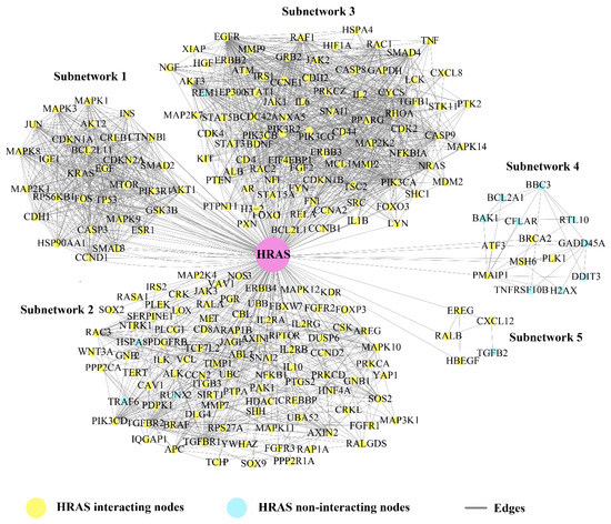 We constructed and analyzed the CRC–PPIN and identified the Bn-Hs. Further, the regulatory network (TF and miRNA) targets of the identified Bn-Hs were constructed. The statistical results of the CRC–PPIN revealed the hierarchical scale-free nature of the network. Overlapped nodes in between the top 10 highest K and BC were considered as Bn-Hs (TP53, CTNBB1, AKT1, EGFR, HRAS, JUN, RHOA, and EGF) in the CRC–PPIN (Figure 1A). The Bn-Hs are the most influencing proteins and provide stability and control of the flow of information in the network. The network showed a disassortative nature due to the calculated negative value of ; the exponent means that the Bn-H is still a significant part of regulating the stability of the network. Based on Bn-H and SN interactions, we found among the Bn-Hs that HRAS showed the highest strength of interaction (216 edges) with all five SNs, indicating it as the key mediator of the subnetworks (Figure 3). In SN-1, functionally related to protein phosphorylation, protein kinase activity and transcription binding, HRAS controls the function of SN-1 with five other Bn-Hs (TP53, AKT1, CTNBB1, JUN, and EGF). The relationship between Bn-H and SN interactions was involved in the regulation of the CRC–PPIN. The network’s crosstalk for these key proteins (Bn-Hs) as well as functional SNs is likely an attempt to maintain structural aspects of the network that facilitate disease biology.