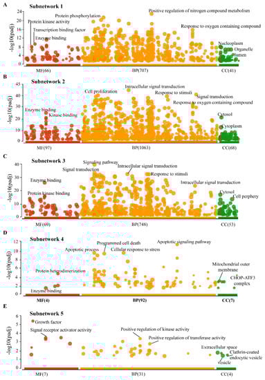 3.4. Gene Ontology (GO) Analysis of Subnetworks
