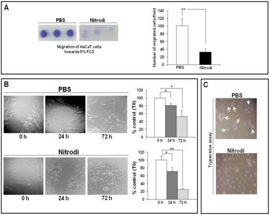 2.7. Nitrodi’s Water Promotes Multi-Oriented, but Not Directional, Epidermal Keratinocyte Migration