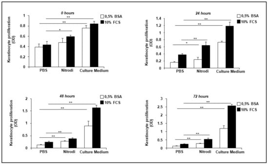 2.8. Nitrodi’s Water Supports Epidermal Keratinocyte Viability and Survival