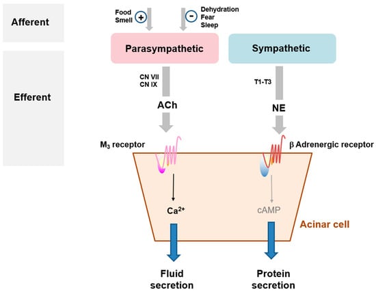 The salivary response to seeing or even imagining sour food occurs because the salivary glands in the oral system receive strong neural input. Salivation is primarily under the control of the autonomic nervous system and is regulated by neurotransmitters and hormones [41,48,49]. Fluid secretion is initiated primarily by the binding of neurotransmitters released from parasympathetic nerves to a specific GPCR. Here, an increase in the intracellular Ca2+ concentration ([Ca2+]i) stimulated by neurotransmitter–GPCR binding in acinar cells is a major trigger for salivation [50,51]. Protein secretion from the salivary glands is regulated primarily by intracellular 3′,5′-cyclic adenosine monophosphate (cyclic AMP) via sympathetic nerves [50]. Cyclic AMP signaling contributes to digestion by lubricating food when chewing and swallowing, and it exerts important antiviral and antibacterial effects on oral tissues (Figure 1).