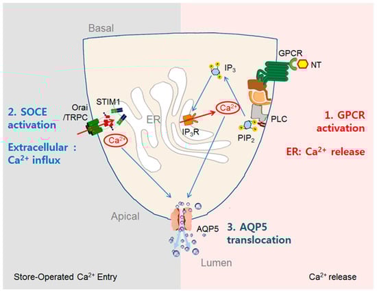 Ca2+ signal transduction and regulation of fluid secretion in salivary gland acinar cells. This figure shows the key signaling events and components involved in the regulation of fluid secretion in salivary gland cells: Fluid is activated by the binding of ACh to subtype M3 mAChRs. Binding activates a GPCR, and the target enzyme is phospholipase C (PLC), which splits phosphatidylinositol 4,5-bisphosphate (PIP2) into diacylglycerol (DAG) and inositol 1,4,5-trisphosphate (IP3). IP3 acts by binding to the IP3R on the endoplasmic reticulum (ER) and releasing the Ca2+ stored there. (First step; Ca2+ release from the ER). Stromal interaction molecule–1 (STIM1) in the ER membrane acts as a Ca2+ sensor, causing structural changes when the ER is depleted, and forms store-operated Ca2+ entry (SOCE) with Orai channels or transient receptor canonical (TRPC) channels expressed in the plasma membrane of acinar cells. This leads to an influx of extracellular Ca2+ (second step; Ca2+ influx via the plasma membrane), followed by the translocation of AQP5 at the apical membrane (third step). These increases in [Ca2+]i as a result of neurotransmitter–GPCR binding induce the regulation of ion transport, the production of an osmotic gradient, and the flow of water.